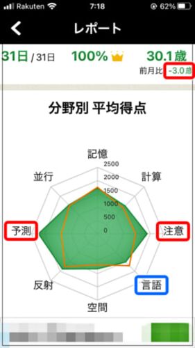 ◆本日のレポート◆ ~7月レポート~ またまたグラフに大きな変化がありました。 「予測力」と「注意力」が盛り返しました。 前回、新しい「予測力」のゲームに手こずり、一気に成績が落ち込んだけれど どうにか慣れて来て成績が戻りました。 数学が苦手なの…